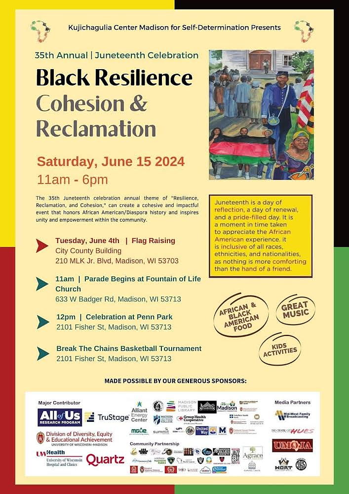 In celebration of its recognition as both a state of Wisconsin (2009) and Federal holiday (2021) the Madison Juneteenth Day Celebration has always compared the same significance to African Americans that the 4th of July has to all Americans, its liberation. It represents freedom, pride, and unity as a collective right to all African Diaspora communities in America.