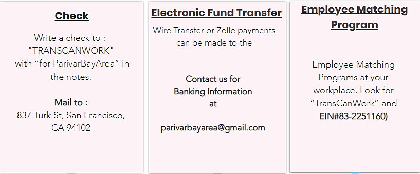 Parivar Bay Area is the nation’s first and only South Asian, Kinnar–Hijrah–led transgender organization, advancing immigrant justice and cultural belonging for Global South TGNCI communities who are too often erased from both immigrant and trans narratives. Your support fuels life-changing programs, Bridges to Belonging: TILARI for accessible legal services, the IELP Immigrant Emerging Leadership Program, Trans Immigrant Resettlement, and vibrant cultural and arts initiatives that restore stability, pride, and connection. We were the first South Asian trans organization to ever receive government funding, and the same one that lost it for being unapologetically trans-centered and trans-led. Every gift, whether $5 or $50,000, directly confronts systemic barriers like housing instability, discrimination, and lack of culturally competent services. When you give, you invest in safety, dignity, legal equity, cultural joy, and the power for our communities not just to survive, but to boldly belong and thrive. For a tax receipt related to your donation, please contact us at parivarbayarea@gmail.com. Tax-deductible donation receipts will be issued by our fiscal sponsor, TransCanWork, EIN: 83-2251160