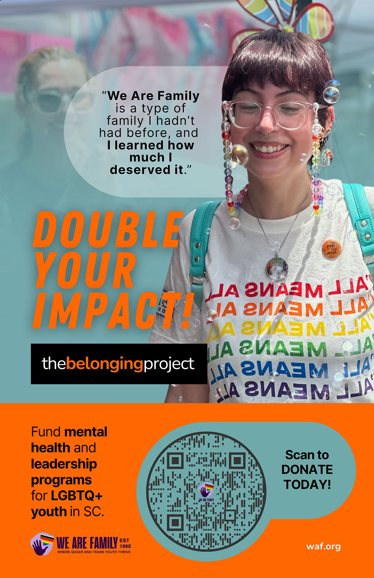 We Are Family is South Carolina's premiere nonprofit that provides life-affirming and life-saving programs for LGBTQ+ young people that have a lasting and measurable impact, with a focus on those who are BIPOC and/or low-income.