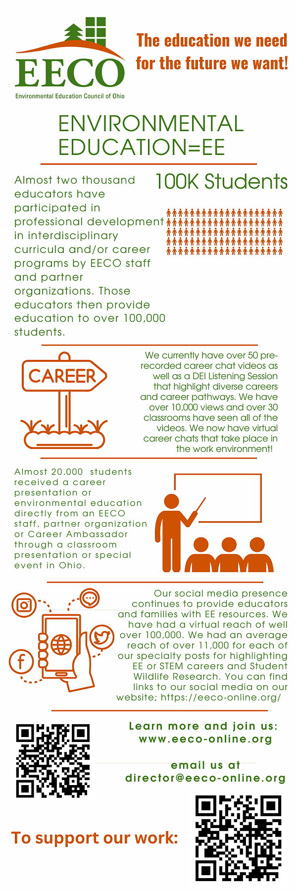 EECO leads in facilitating environmental education that fosters global stewardship and a sustainable future for all Ohioans. It is our vision for all Ohioans to be environmentally literate and engage in decision making that ensures sustainability for future generations. We invite you to join us!