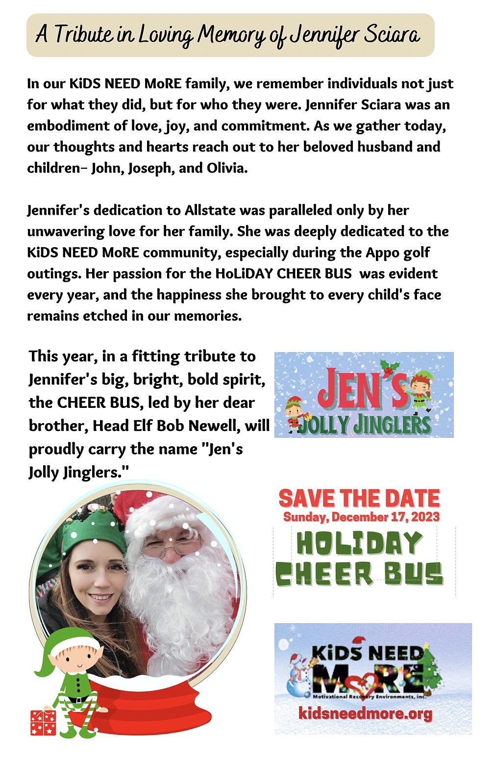 This year The First Newell Cheer bus is being renamed to Jen's Jolly Jinglers in memory of my sister Jen. The cheer bus was her favorite holiday event and what better way to keep her memory alive then by putting smiles on kids' faces during the holidays. Below is a link to make donations to our bus. Soon a link will be available to purchase gifts for the kids on our bus.
