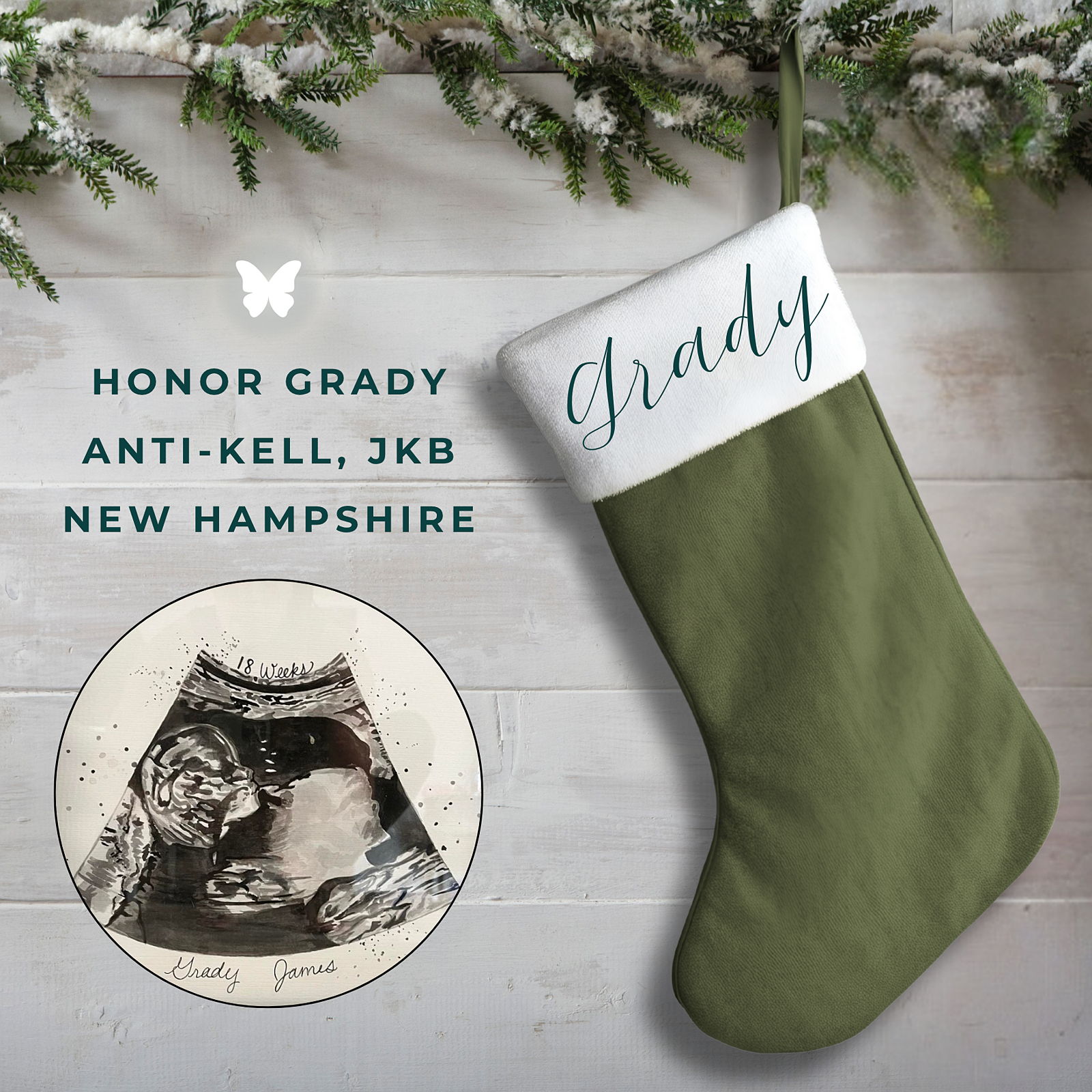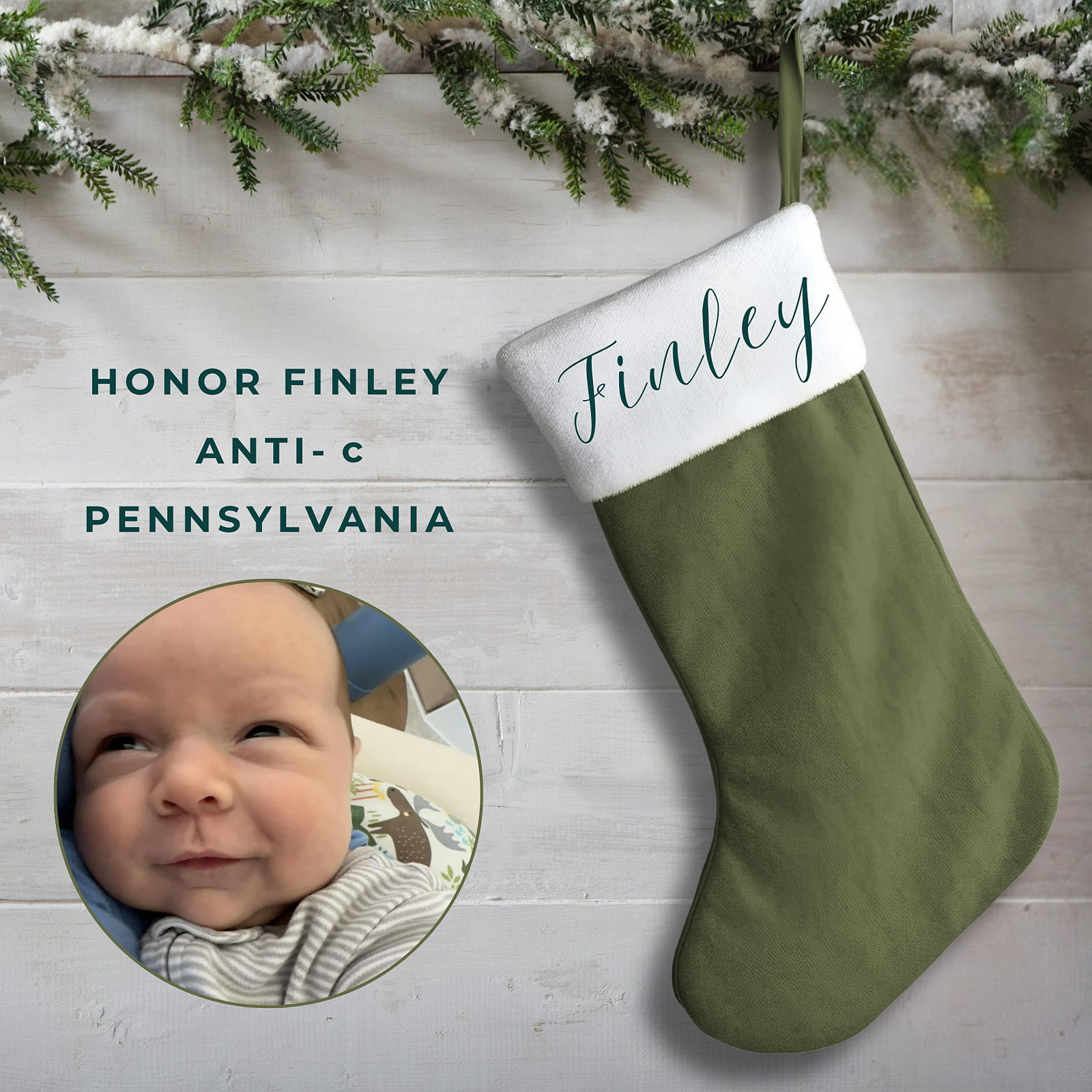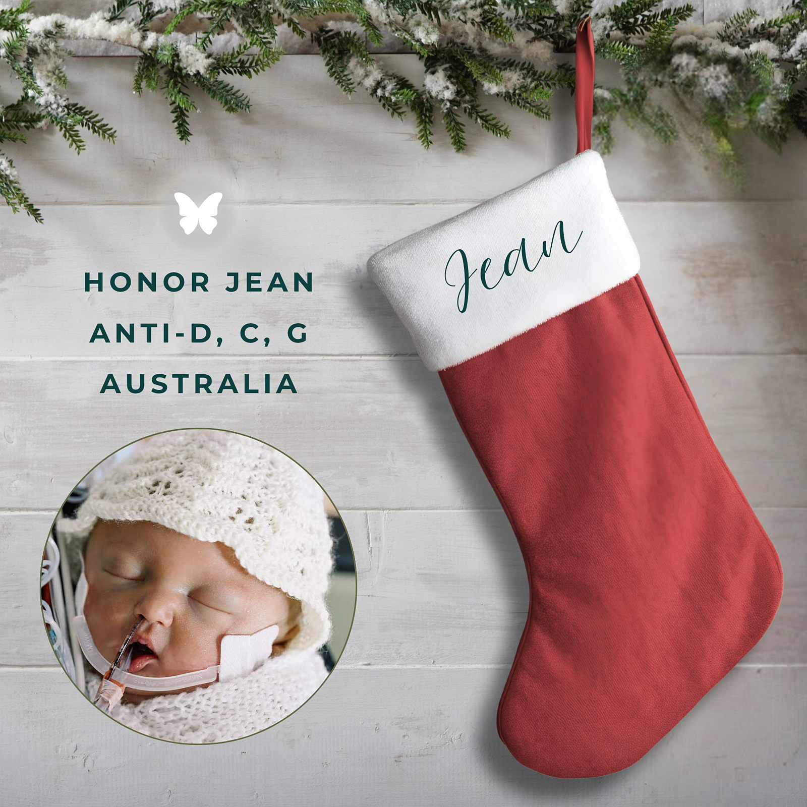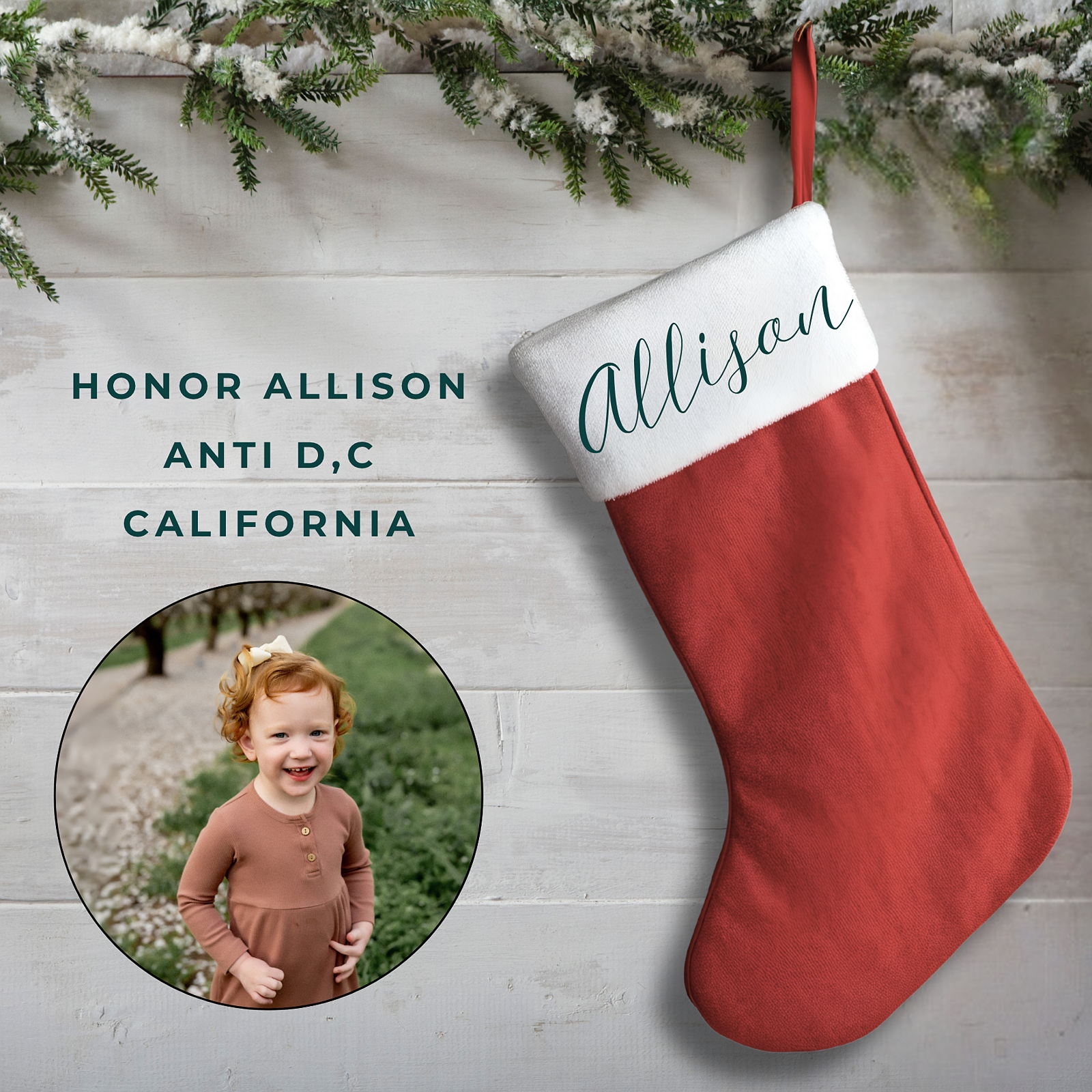 Each donation given to a baby’s stocking goes directly to The Allo Hope Foundation, the longest running 501(c)(3) nonprofit organization working globally to end preventable stillbirth and infant death caused by HDFN. Your name is then written on a card and placed in the stocking as a tangible representation of the safety, provision, and hope your donation will bring to other families facing the same diagnosis. By the end of the season, each stocking serves as a beautiful testament to love, filled with the names of friends, relatives, and strangers who gave in honor of a child’s life.